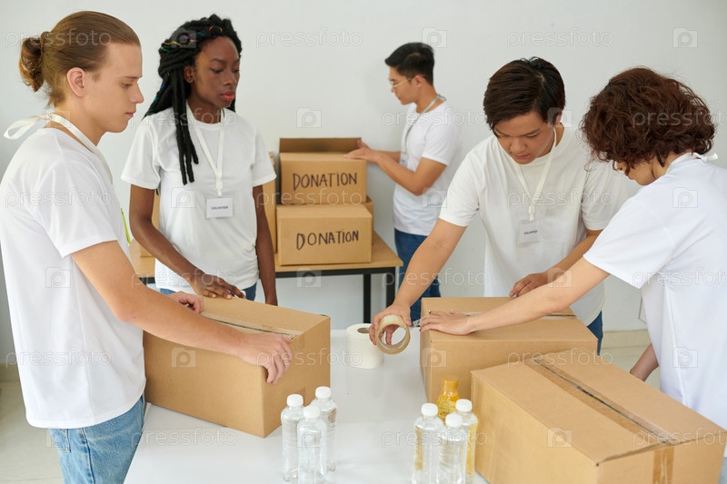 Добровольцы запирают и запечатывают коробки