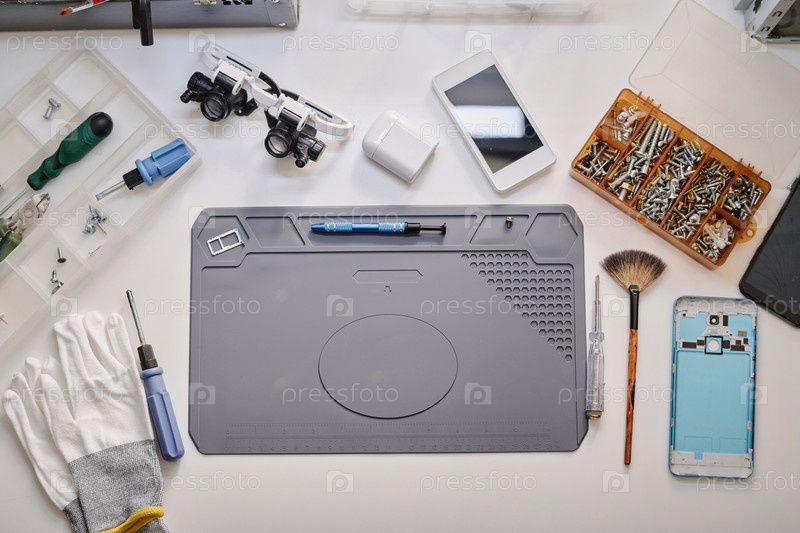 Рабочее место ремонтника подготовлено к диагностике сломанного смартфона