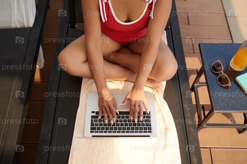 Женщина в купальнике работает на ноутбуке