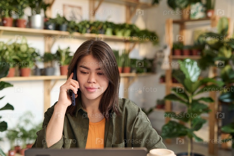Молодой цветочник использует технологии для общения с клиентами