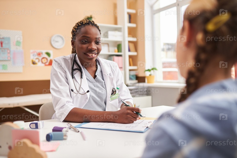 Чернокожая женщина как педиатр разговаривает с ребенком в клинике