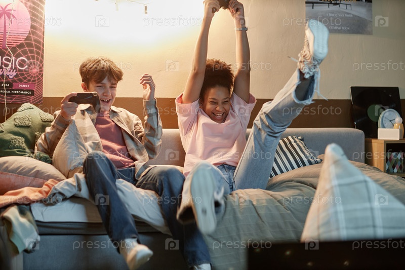 Друзья играют в видеоигры вместе, празднуя победу