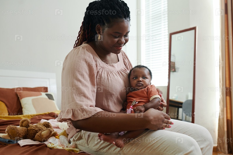 Черная женщина сидит на кровати с девочкой
