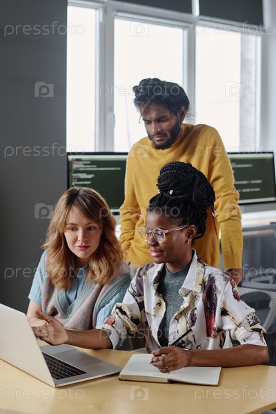 Молодые офисные сотрудники вместе просматривают информацию на экране компьютера