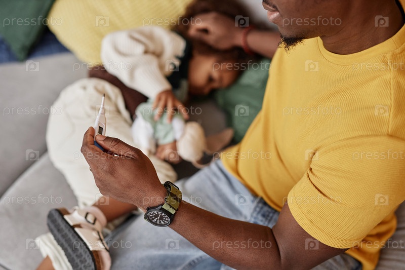Отец принимает температуру ребенка