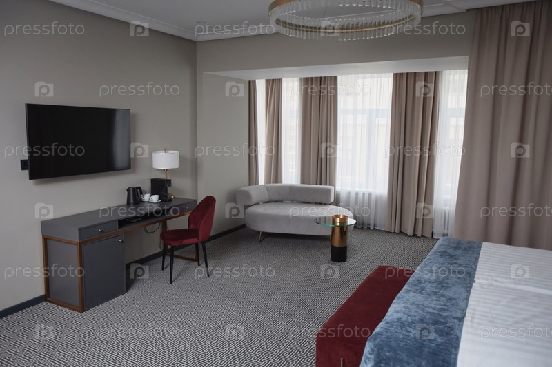 Интерьер гостиничного номера с дизайнерской мебелью и телевизором
