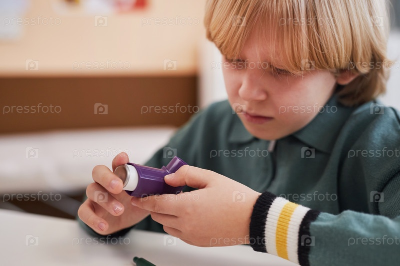 Маленький мальчик держит ингалятор и осматривает его в клинике