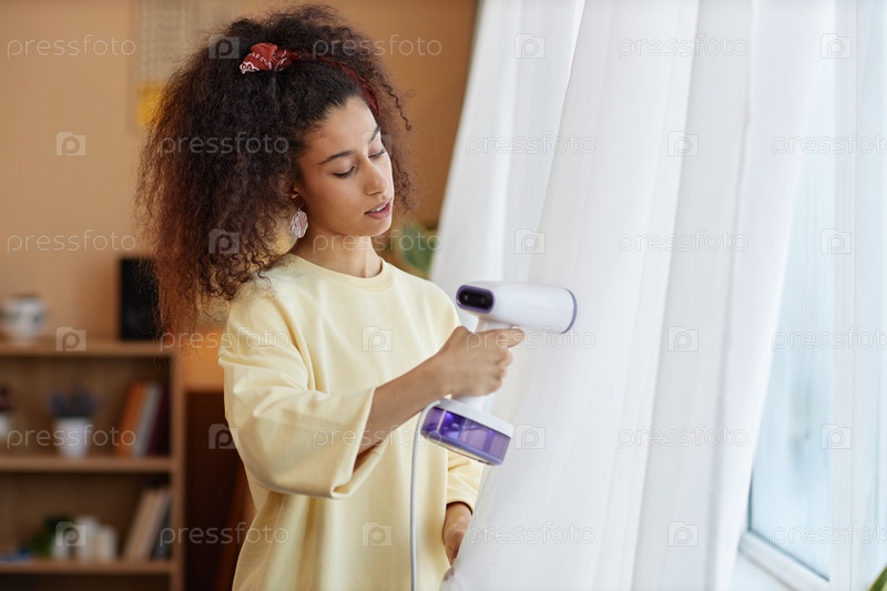 Молодая женщина испаряет шторы во время весенней чистки