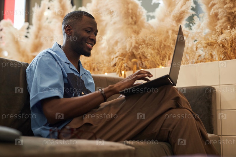 Афроамериканский мужчина использует ноутбук, сидя на диване