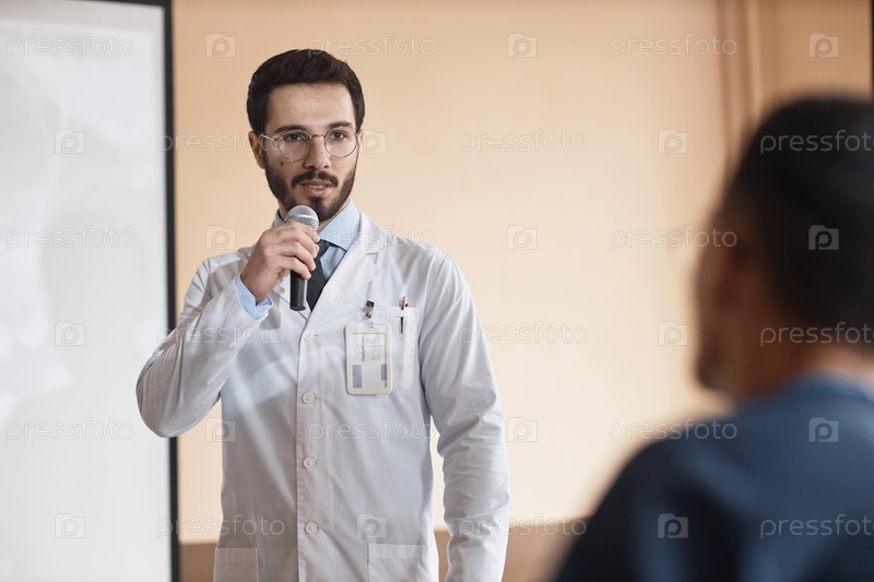 Медицинский практик, разговаривающий через микрофон на конференции Мужчина