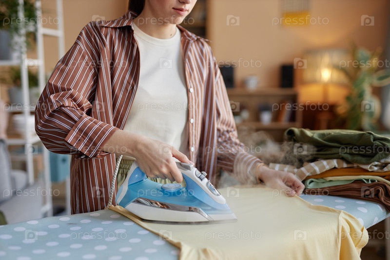 Закройте женщину, гладящую одежду в день стирки