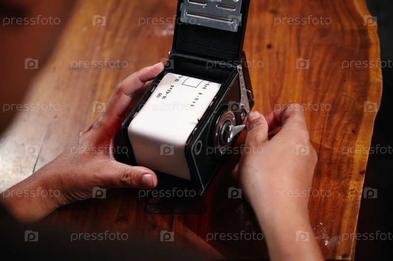 Фотограф, затягивающий пленку на камеру