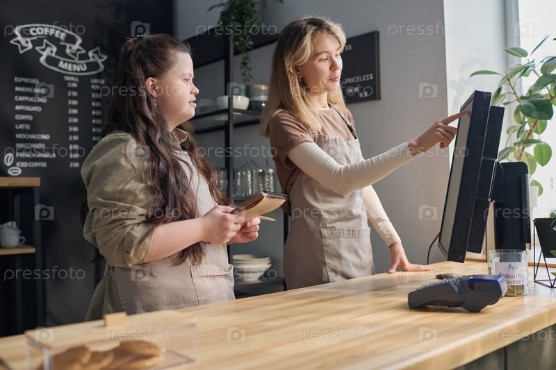 Официантка указывает на компьютерный экран