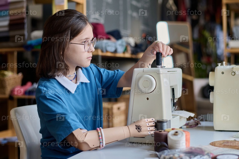 Девушка с протезированной рукой, использующая швейную машину в ателье