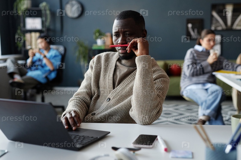 Утомленный чернокожий мужчина играет карандашом за рабочим столом