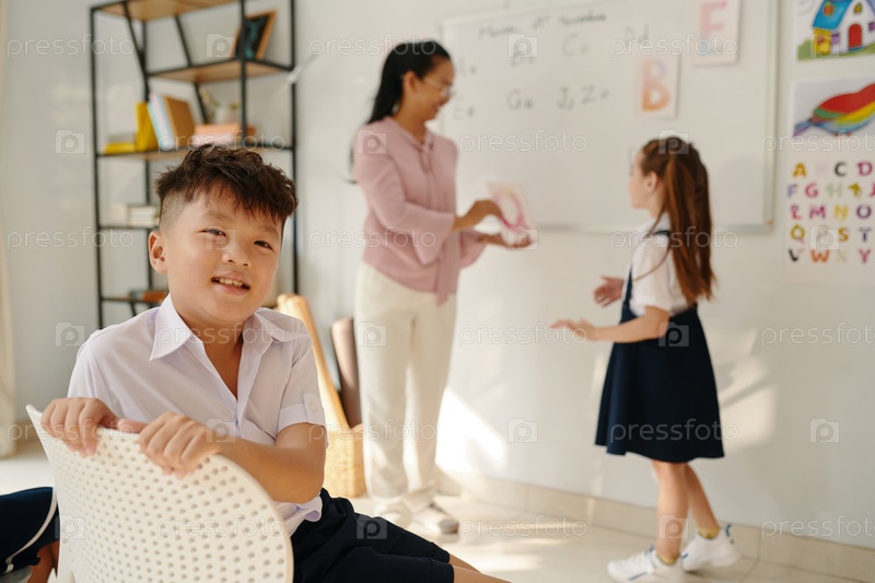 Наслаждаясь учебой в школе мальчик
