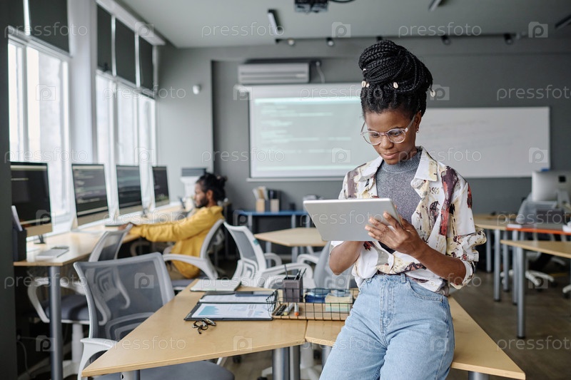 Работница офиса работает на своем цифровом планшете
