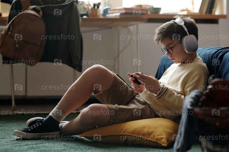 В наушниках играет в видеоигры Мальчик