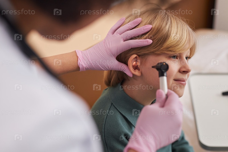 Врач, осматривающий уши и слух детей в клинике