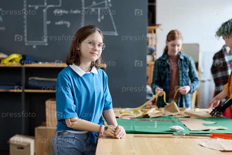 Улыбающаяся девушка с протезированной рукой в ателье