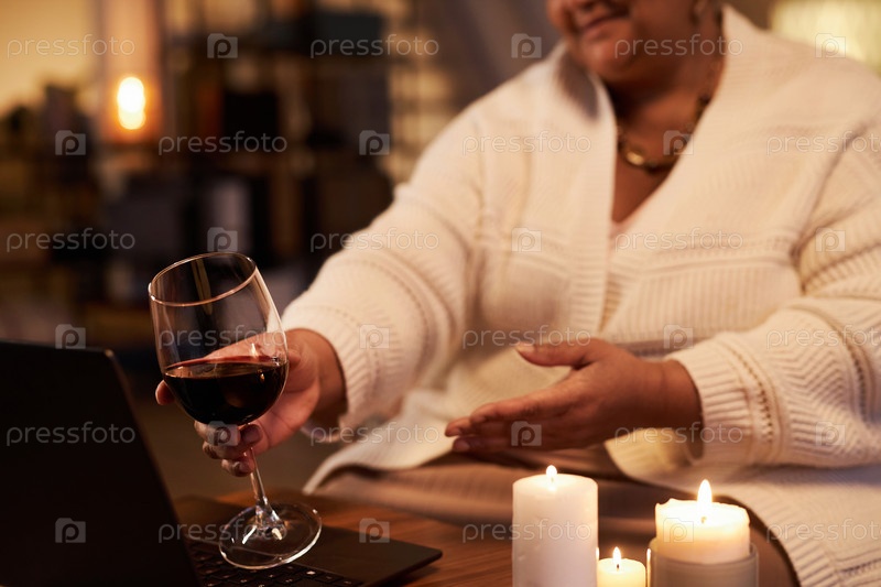 Ключевое изображение старшей чернокожей женщины, кланяющейся с винным бокалом на экран