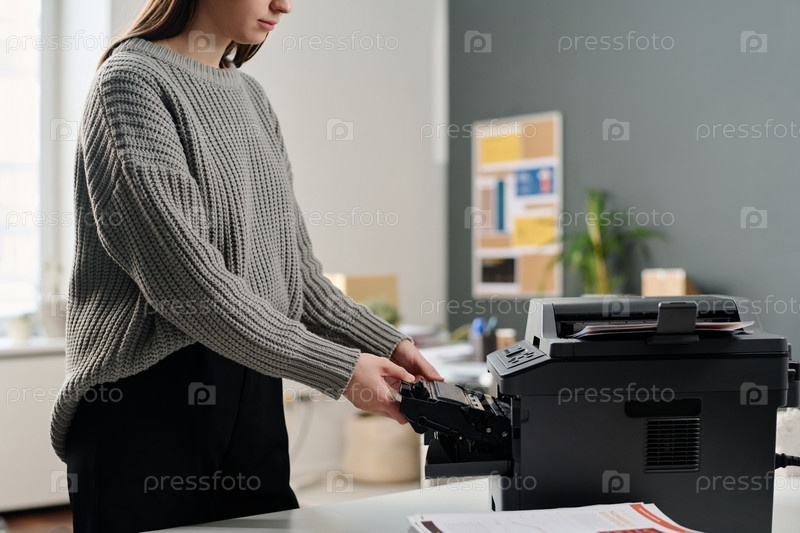 Молодая женщина пополняет чернильный картридж на работе в офисе