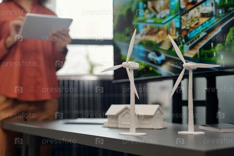 Две модели ветряной мельницы, стоящие на столе