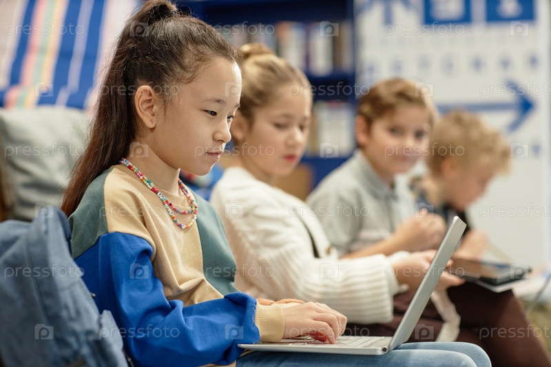 Азиатская девушка использует ноутбук в библиотеке с детьми на заднем плане