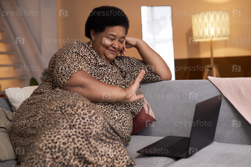 Чёрная старшая женщина, размахивающая видеочатом дома