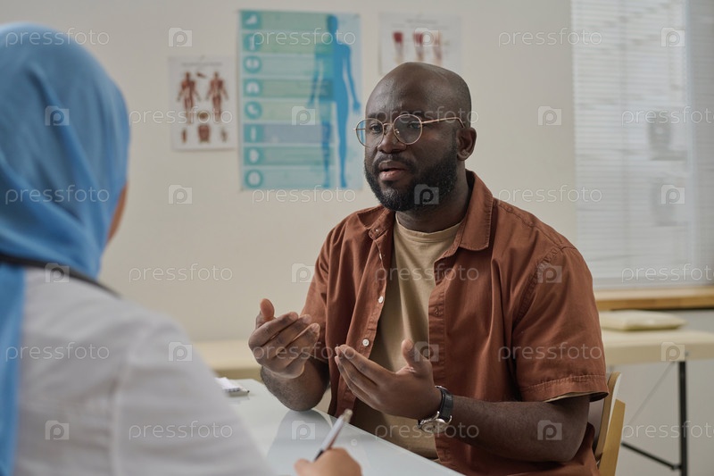 Пациент разговаривает о своем здоровье с врачом во время приёма мужского пола