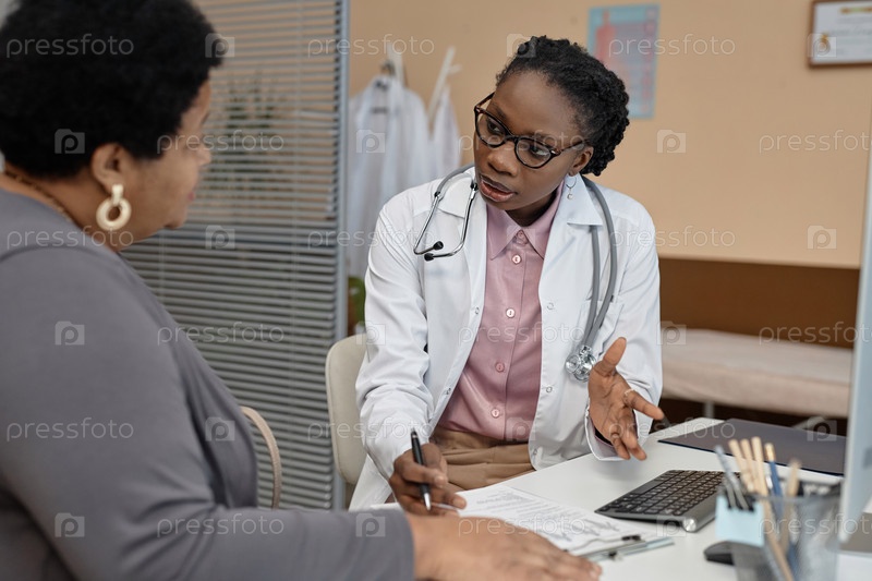 Женщина-врач разговаривает с пациентом во время визита