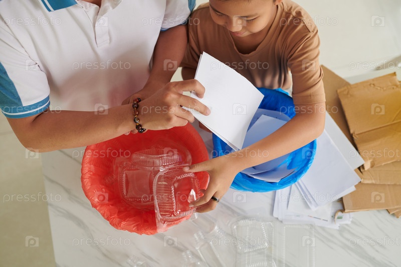 Отец учит сына сортировать отходы