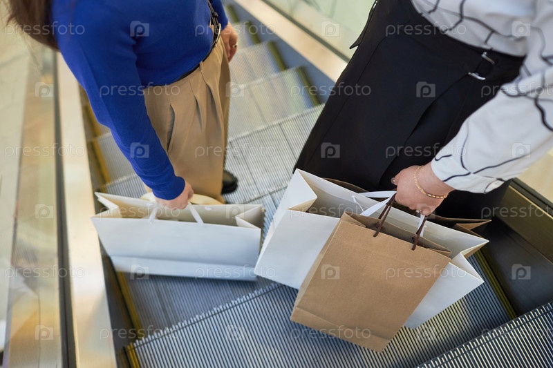 Молодые женщины держат сумки на эскалаторе в торговом центре