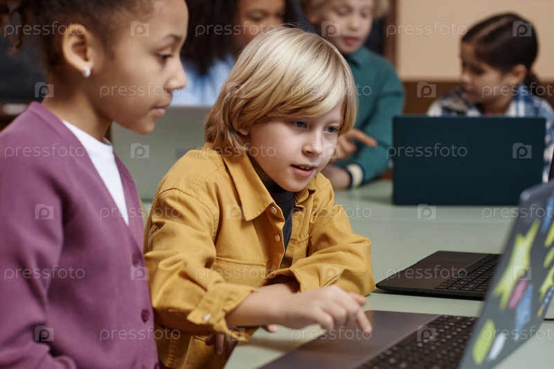 Использование ноутбука и выполнение онлайн-тестов в школьном классе мальчик