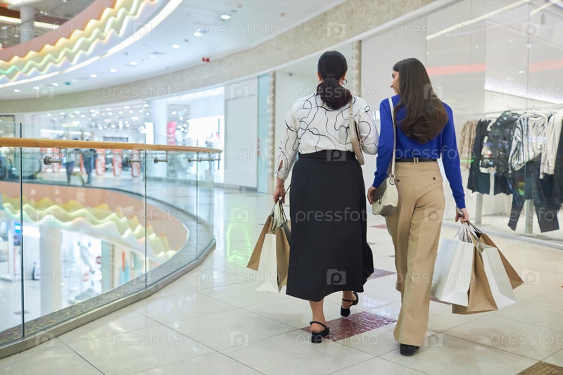 Обратный взгляд на две девушки, которые вместе наслаждаются шопингом