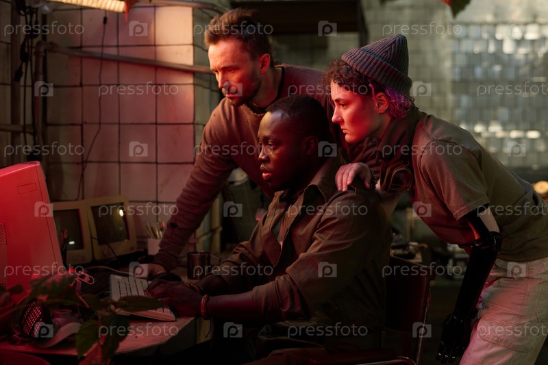 Друзья проверяют данные на старом компьютере в пост-апокалиптическом убежище
