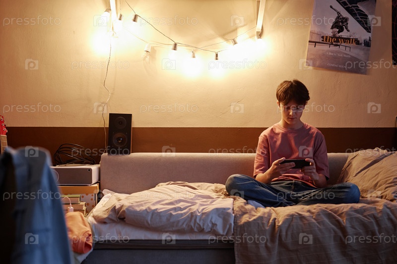 Подросток играет в мобильные игры, сидя на кровати