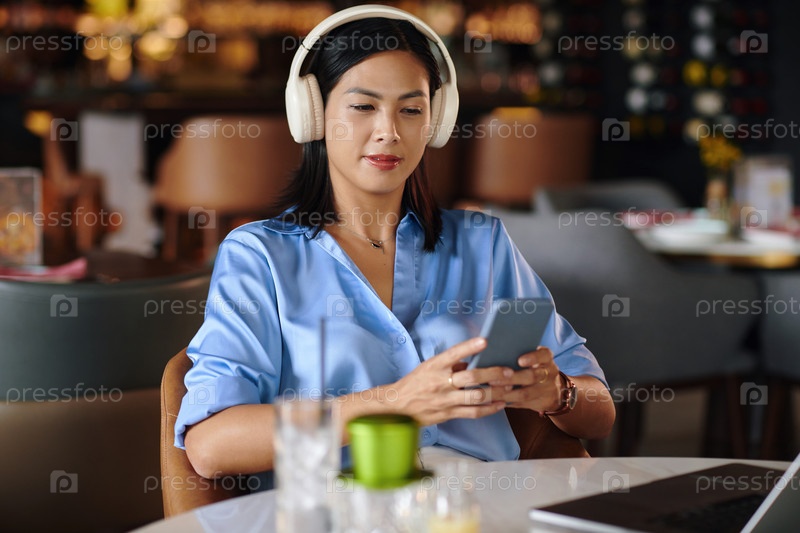 Женщина, слушающая музыку на смартфоне