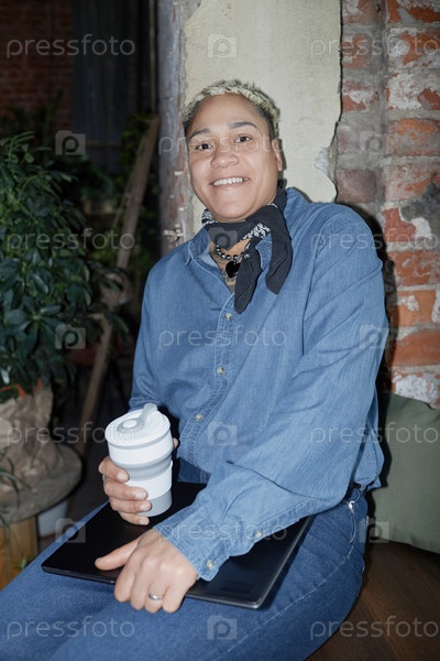 Черная женщина, одетая в джинсы и улыбающаяся перед камерой