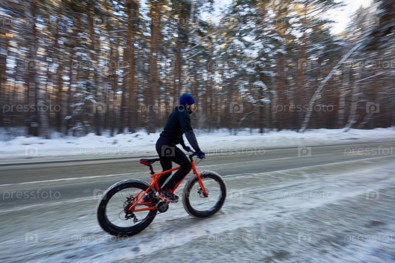 Велосипедист, едущий на профессиональном велосипеде по дороге зимой