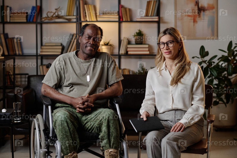 Психотерапевт и ее чернокожий пациент позируют вместе в офисе