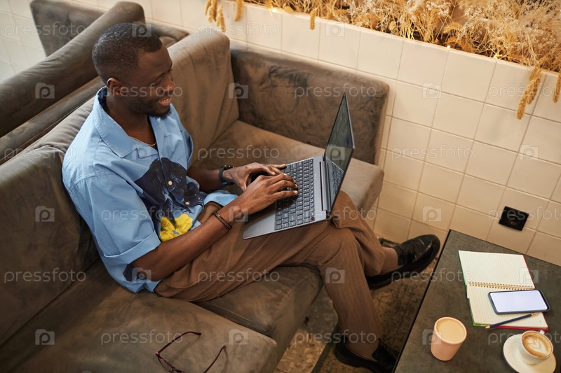 Чернокожий мужчина, использующий ноутбук сидит на диване в офисе и улыбается