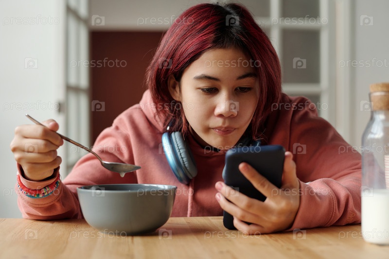 Девушка со смартфоном завтракает