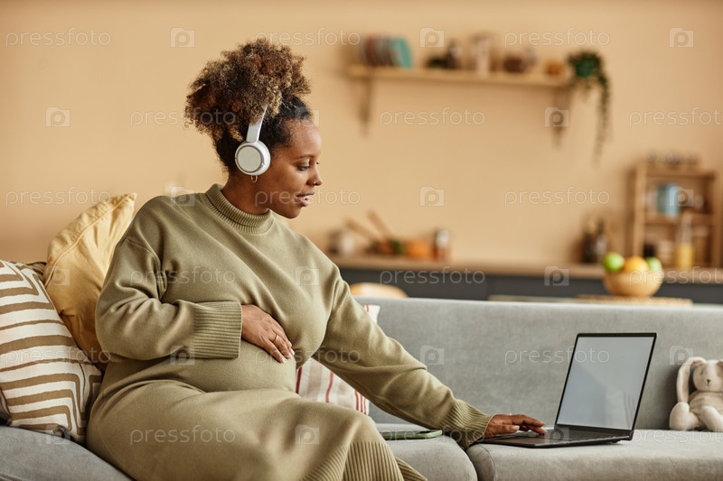 Беременная женщина в наушниках печатает на ноутбуке