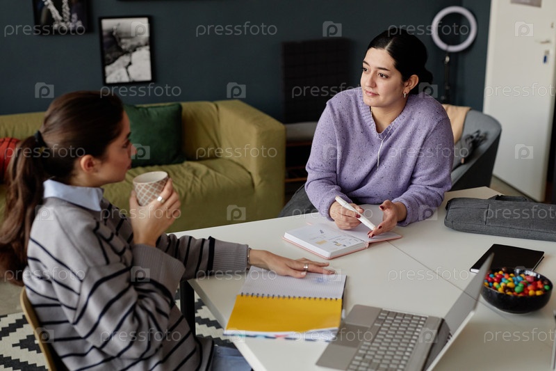 Две женщины, разговаривающие за столом в офисе