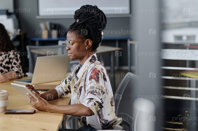 Молодой афроамериканский офисный работник печатает на цифровом планшете, сидя за рабочим столом