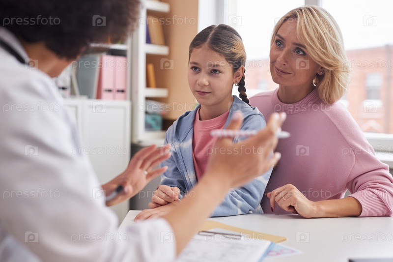 Мать и дочь, посещающие врача в клинике