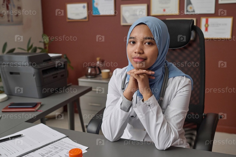 Портрет мусульманской женщины-врача, сидящей на своем рабочем месте