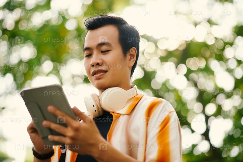 Молодой человек с планшетом смотрит видео