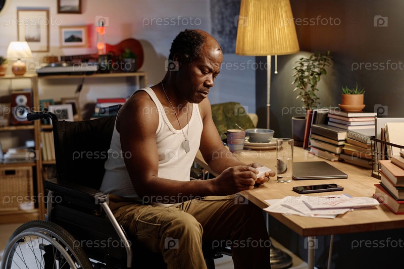 Чернокожий мужчина в инвалидном кресле сидит за столом дома и держит ящик с таблетками